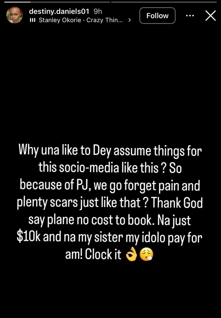 “Why una like to dey assume things for this socio-media like this? So because of PJ, we go forget pain and plenty scars just like that? Thank God say plane no cost to book. Na just $10k and na my sister, my idolo, pay for am! Clock it.”